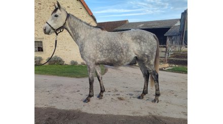 Jument grise 1m60 environ, par Jukebox Jury, pas couru, soeur de 2 BT en obstacle.