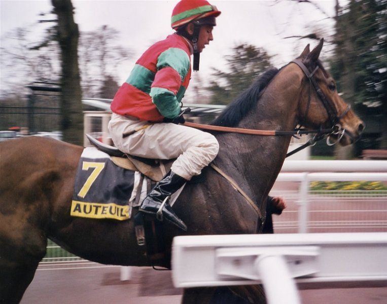 Michel Maussion en 2001 à Auteuil après une victoire pour Gilles Chaignon, sur Satin Turk