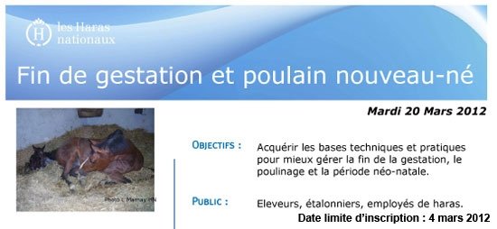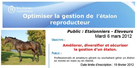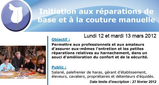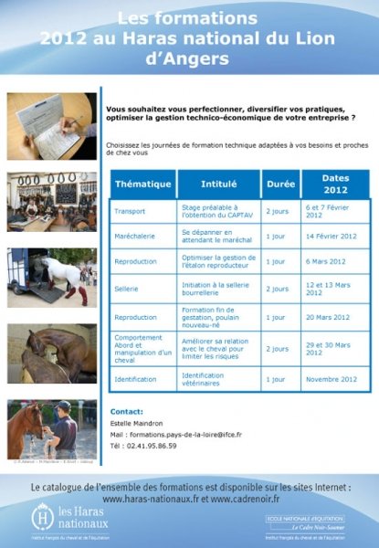 L'IFCE intensifie son programme de formation au Haras National du Lion d'Angers. Voir ci-dessous les détails de 3 formations proposés en mars : Gestion de l'étalon, couture et sellerie, fin de gestion et nouveau né. Pour les inscriptions : Estelle Maindron (02 41 95 86 59 - formations.pays-de-la-loire@ifce.fr)