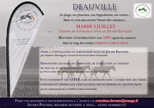 Tout juste un mois après leur 1e opération d'envergure le jour du Prix du Jockey-Club à Chantilly, l'Asso des Jeunes Eleveurs organise une réunion d'information le 3 juillet à Deauville, pendant les ventes Arqana. Voir les infos ci-dessous.