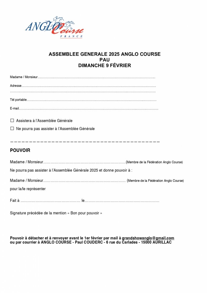 Notre assemblée générale se déroulera le DIMANCHE 9 FÉVRIER 2025 à l'HÔTEL MERCURE DE PAU, jour du GRAND CROSS sur l'Hippodrome du Pont-Long.