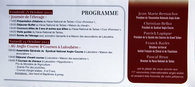 Pour la 11e fois, le Syndicat Anglo-Course orchestre le plus grand rendez-vous de l'année pour la race : les rencontres internationales, composées du concours de modèles et allures le vendredi 18 octobre dans la cour du Haras National suivi le samedi 19 octobre par l'Assemblée Général du syndicat puis la grande réunion de courses classiques dites des ministères sur l'hippodrome de Laloubère. VOIR LE PROGRAMME COMPLET.