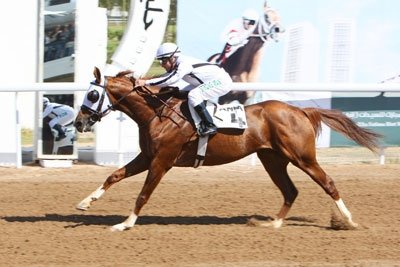 Aawaj Al Khalidiah (Roberto Perez) wins the second most important race of the day. He is by Tiwaiq.