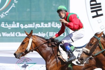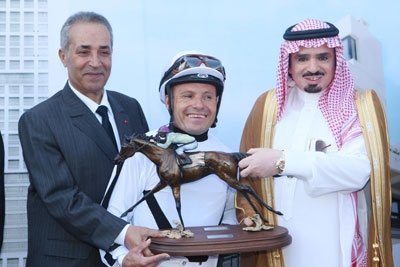 Already winner of this race in 2011, Shaghmoom Al Khalidiah keeps his title easily, this time under the chilean rider Roberto Perez. This 8yo son ofTiwaiq is trained by Cheikh Mutlaq bin Mashref (right).