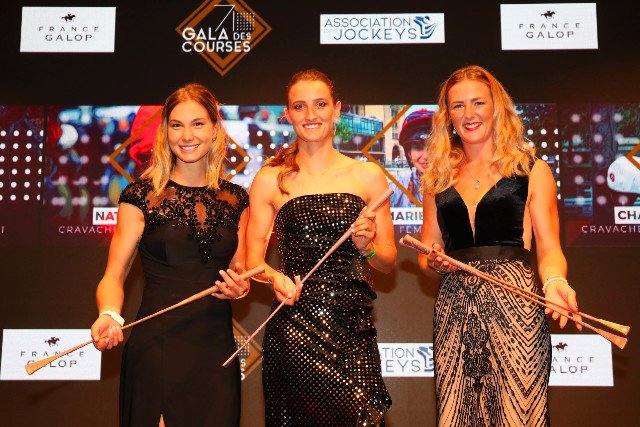 Trois des Cravaches d'Or féminines des années 2019 & 2020: Marie Velon, Coralie Pacaut et Charlotte Pritchard. Manque à l'appel, Nathalie Desoutter (© APRH)