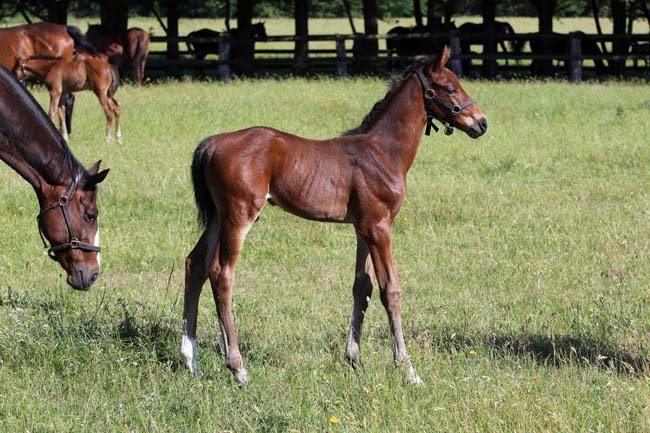 On pose fièrement pour ce jeune mâle de Masterstroke et Argovie. Gagnante en plat et en obstacle, et soeur de 3 black-types en obstacle, elle a déjà produit le placé de Gr.1 Arverne.