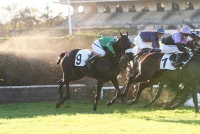 Jockey de Net Lovely, Jonathan Plouganou a frôlé la chute dans le sillage du futur vainqueur Lagunak (casaque violette et noire) à la réception du rail-ditch en fence lors sa dernière sortie dans le Prix La Haye Jousselin, dont elle terminera 2e.