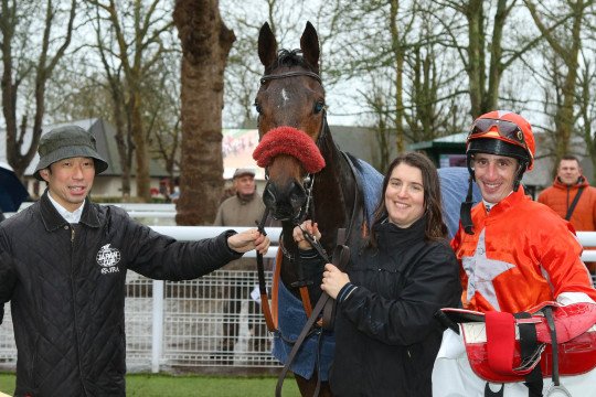 Oreilles dressées, Bal de Rio pause aux côtés de son entraîneur M.Satoshi Kobayashi, son jockey Marc Nobili & sa lad