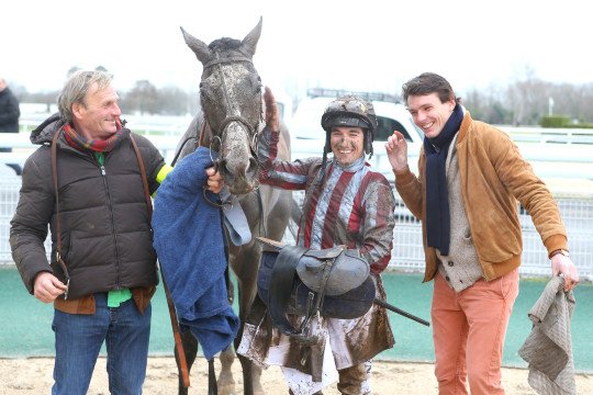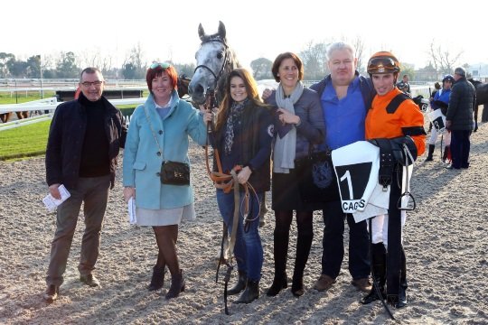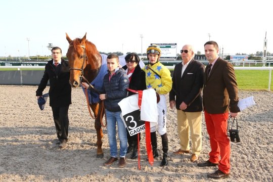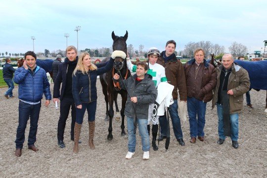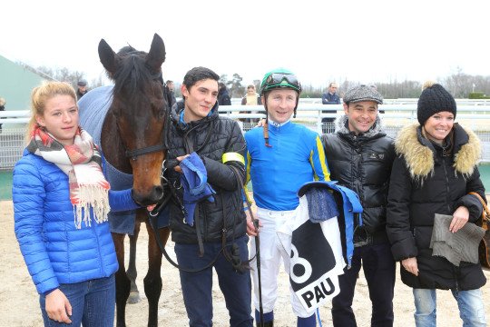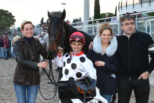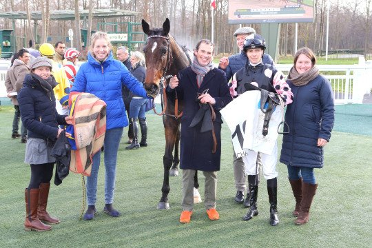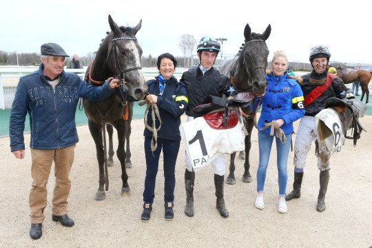 Réclamé en décembre dernier, Poliboy, fait la joie de son entourage, ici Mrs Cottin père & fils et le jockey Kévin Nabet.
