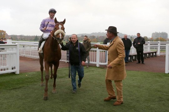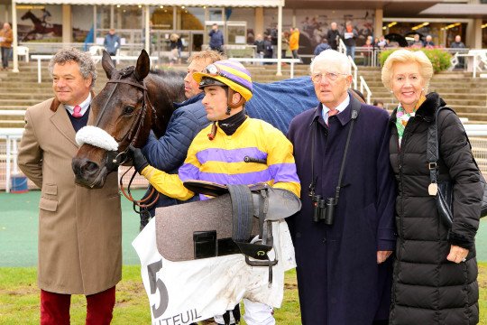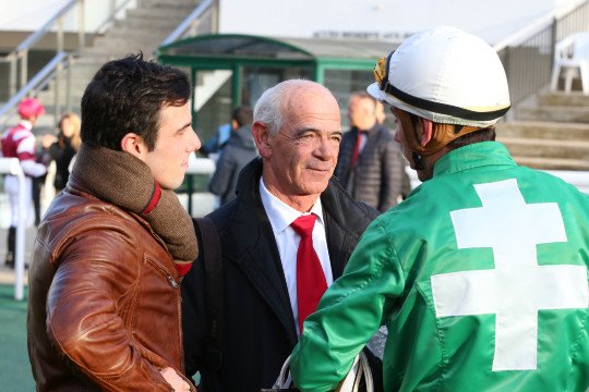 Jour de gloire pour l'entraineur Jean-Paul Busson, ici rejoint par Christian Bauer, grâce au succès d'Until Dream à Saint-Cloud