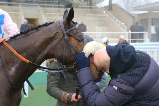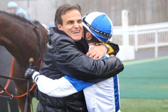 Rodolphe Collet propriétaire et entraineur de Zoé La Gribouille (Siyouni), embrasse son cheval après sa victoire de Mardi à Chantilly.