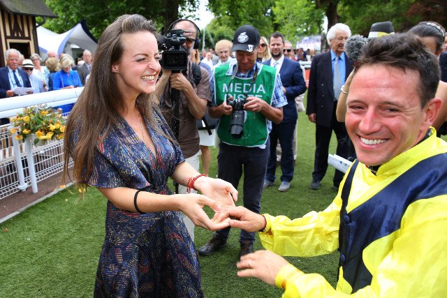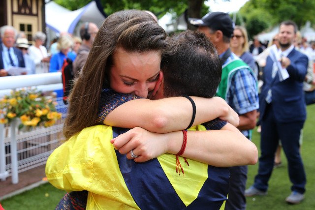 LE Gros Quinté de l'été, le Grand Handicap de Deauville, dans la poche d'Anastasia Wattel ! Ca valait bien une tendre accolade pour le jockey d'Infirmier (Distorted Humor), Grégory Benoist, quoiqu'un peu plus que jockey dans la vie d'Anastasia...