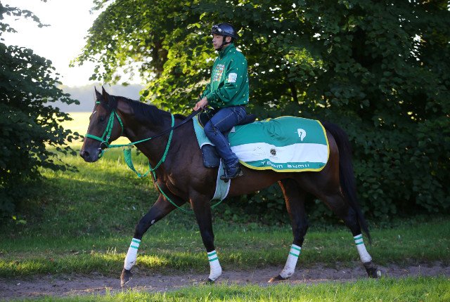 Pendant que Kiseki (Rulership) se détend avant son entraînement, sur la piste des Aigles, en prévison de l'Arc de Triomphe