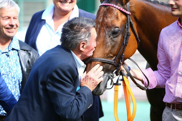 Doctor Fontenaille (Doctor Dino) ouvre son palmarès en haies, à la plus grande joie de son éleveur et ancien entraîneur-propriétaire, Serge Menand, qui l'embrasse tendrement.