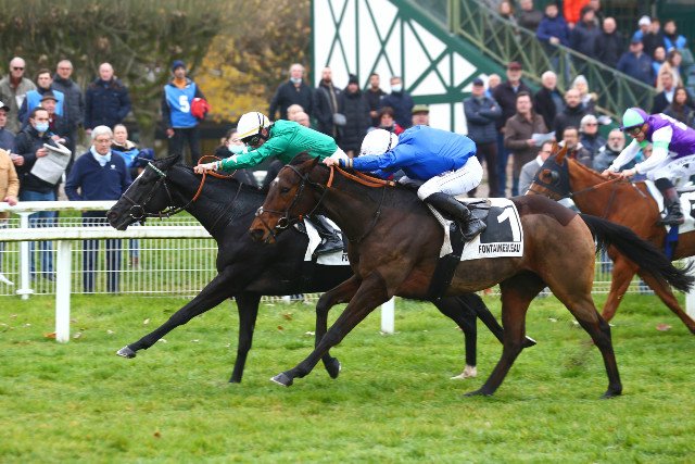 Jeudi à Fontainebleau : Moon A Lisa (casaque bleue et jaune) s'allonge bien pour remporter l'autre Listed du jour