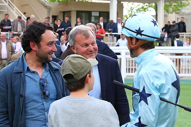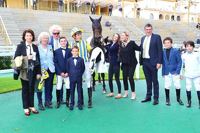 Dimanche à ParisLongchamp : victoire dHaya Zark sous la selle de Christophe Soumillon, accompagnés sur la photo par Mme Odette Fau et les prodiges des courses de poney.
