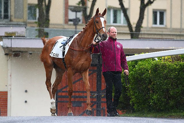 Lundi à Saint-Cloud : Harry Way et son lad sous la pluie avant le Prix Greffulhe.