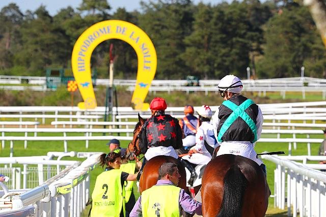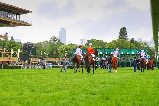 Dimanche à ParisLongchamp : les concurrents se dirigeant vers le départ du Prix Gold River - Fonds Europeen de l'Elevage Listed.