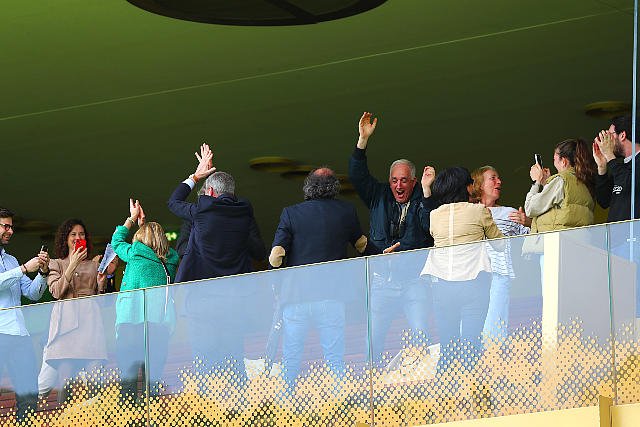 Dimanche à ParisLongchamp : la tribune en joie après la victoire d' Engaliwe et Aurélien Lemaitre dans le Prix de la Seine Listed.