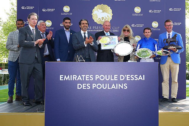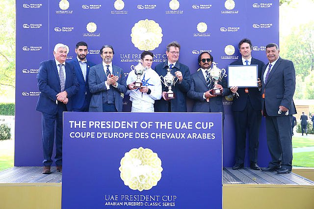 Dimanche à ParisLongchamp : le podium de la Coupe D'Europe des Chevaux Arabes (Gr.1 PA), avec les vainqueurs Christophe Soumillon, François Rohaut, Abdullah Al-Attiyah, Faisal Al Rahmani.