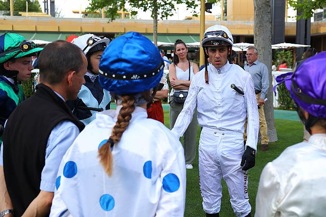 Jeudi à ParisLongchamp : Christophe Soumillon donnant des conseils avant la Finale des Courses Ecole de Galop.