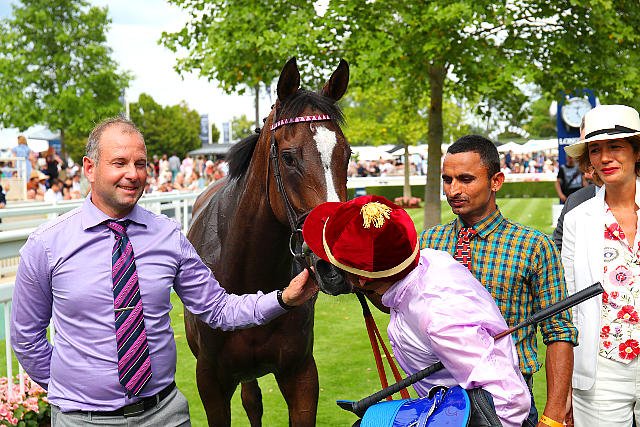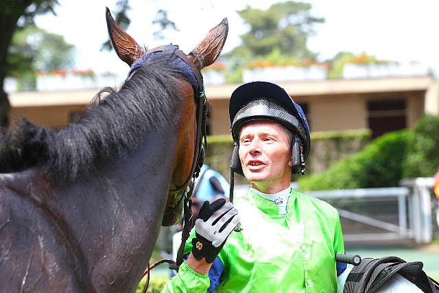 Dimanche à Chantilly : Cristian Demuro embrasse La Mehana après sa victoire dans le Prix Pawneese Longines-Fonds Européen de l'Elevage (L.).