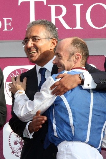 Une bonne accolade d'Olivier Peslier envers son 2ème patron, le Cheik Abdullah Al Thani .