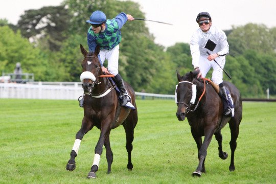 Les petits losanges en damiers de Bel La Vie dominent le grand losange de Shannon Rock, qui a un instant eu l'avantage et dont le jockey David Cottin affiche une cruelle déception.