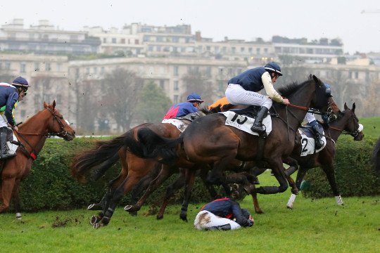 Le cheval nommé Non Interdit a esquivé Ervan Chazelle en sautant in extremis par dessus ce jockey à terre