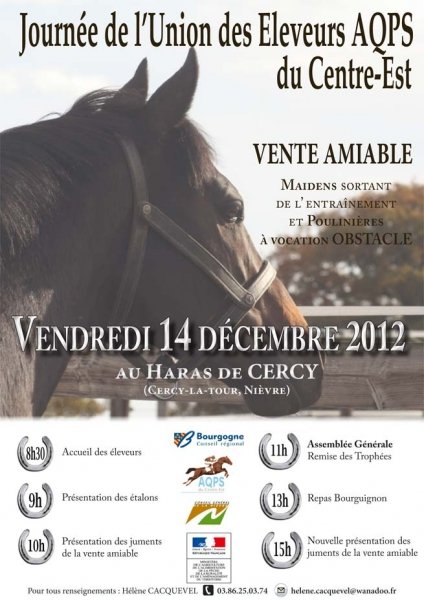 Le 14 décembre à partir de 9h00, le Haras de Cercy dans la Nièvre sera le théâtre d'une nouvelle édition de la Journée des Eleveurs organisée par l'Union du Centre-Est qui fait en même temps son assembée générale annuelle. Cela consiste, sur une journée complète, à une présentation des 7 étalons du Haras (voir la liste), suivie de la présentation des poulinières, maidens sortant de l'entrainement et juments à vocation obstacle (AQPS et PS). Celles-ci seront sorties 2 fois, le matin et l'après-midi après l'assemblée générale de 11H00 et l'indispensable repas bourguignon.