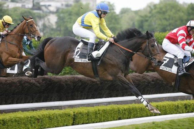 Après une excellente carrière de plat, Blue Bresil, ici monté par Nathalie Dessouter, est parvenu à conclure 2e du Prix Jacques d'Indy (Gr.3) à 3/4 de longueurs de Long Run, en faisant ses 1e pas en obstacle ! (PHOTOS APRH)