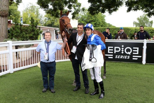 M.Philippe Sogorb entraîneur de cette fille de Soave. Elle devient titulaire de son 1er succès dans une course de Goupe