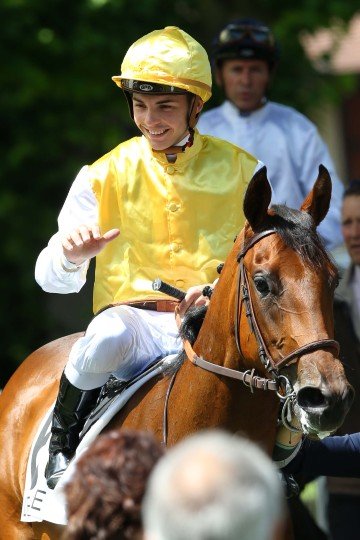 La joie de Maxime Guyon qui s'adjuge ce Gr.1 avec Silverwave pour l'entraînement de M.Pascal Bary