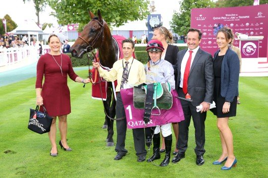 Les heureux co-propriétaires Mrs Tabor & Smith de Found (de gauche à droite) - M.Mickaël Tabor peut-être aux anges, il est co-propriétaire des 3 chevaux de tête de cet Arc 2016