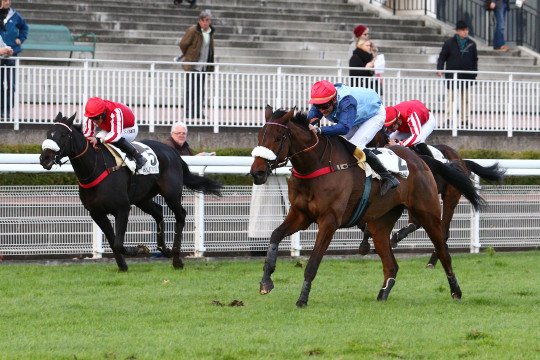 Blue Dragon associé à Jonathan Plouganou a remporté le Prix Léon Olry-Roederer Gr.2 pour l'entraînement de M.Guy Cherel