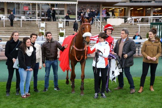 Une belle photo pour de Bon Coeur entourée de ses proches dont ses éleveurs et propriétaires Mr & Mme De Lageneste et M.Detré, son entraîneur M.François Nicolle et son jockey James Reveley