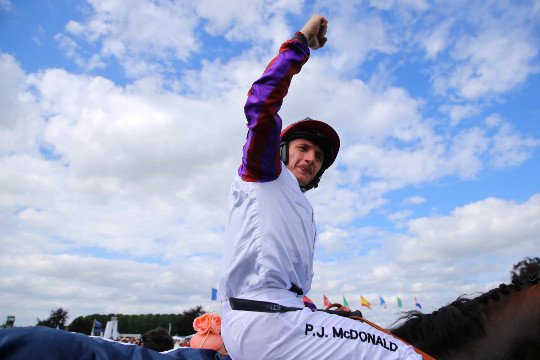PJ McDonard célèbre sa victoire. 3 ans après son compatriote John Gosden, les couleurs anglaises s'imposent cette année.