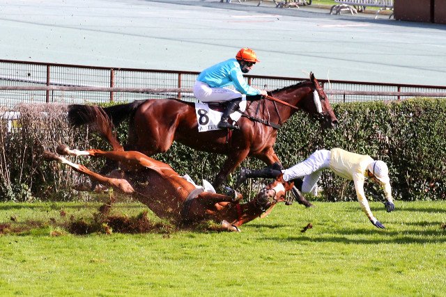 Terminus, tout le descend ! Les chutes sont le risque de tout jockey d'obstacles. Ici, Alexandre Seigneul en fait les frais, sans gravité pour chacun des protagonistes