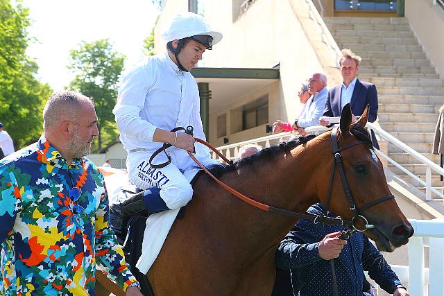 Mardi à Chantilly : Mickael Bazalona portait la casaque société. La personne à côté de lui ramène de la couleur