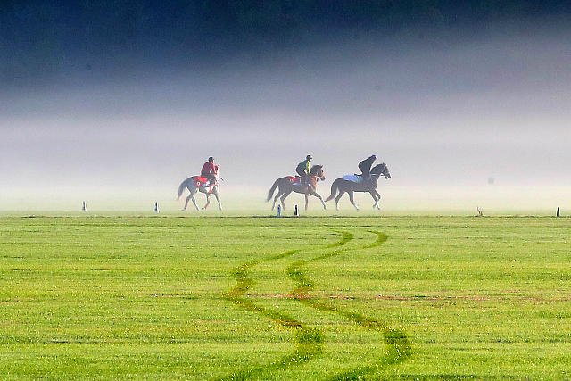 Jeudi aux Aigles : les japonais Deep Bond, Stay Foolish et Entscheiden s'exercent sur le gazon en vue du week-end de l'Arc